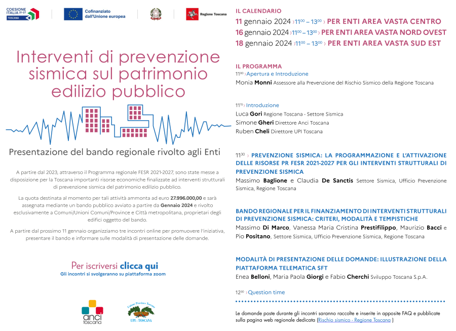 A partire dal 2023, attraverso il Programma regionale FESR 2021-2027, sono state messe a disposizione per la Toscana importanti risorse economiche finalizzate ad interventi strutturali di prevenzione sismica del patrimonio edilizio pubblico. La quota destinata al momento per tali attività ammonta ad euro 27.996.000,00 e sarà assegnata mediante un bando pubblico avviato a partire da Gennaio 2024 e rivolto esclusivamente a Comuni/Unioni Comuni/Province e Città metropolitana, proprietari degli edifici oggetto del bando. A partire dal prossimo 11 gennaio organizziamo tre incontri online per promuovere l’iniziativa, presentare il bando e informare sulle modalità di presentazione delle domande.