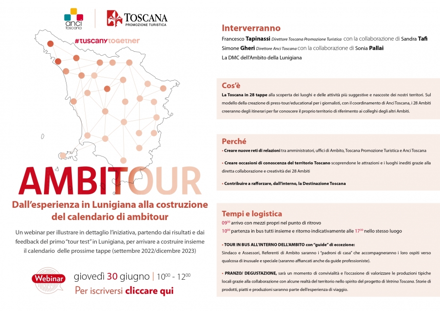 Il 28 giugno ha preso il via il progetto AMBITOUR organizzato insieme a Toscana Promozione Turistica con l'obiettivo di creare nuove occasioni e opportunità per incentivare gli scambi e le relazioni tra gli ambiti turistici. Dopo lo splendido successo della prima tappa sperimentale in Lunigiana, è stato tutto in discesa l’incontro on line per fare il punto su presente e futuro di “Ambitour”,  l’innovativa iniziativa per sostenere e qualificare il turismo della Toscana, che coinvolge direttamente gli amministratori e i 28 ambiti turistici della regione.