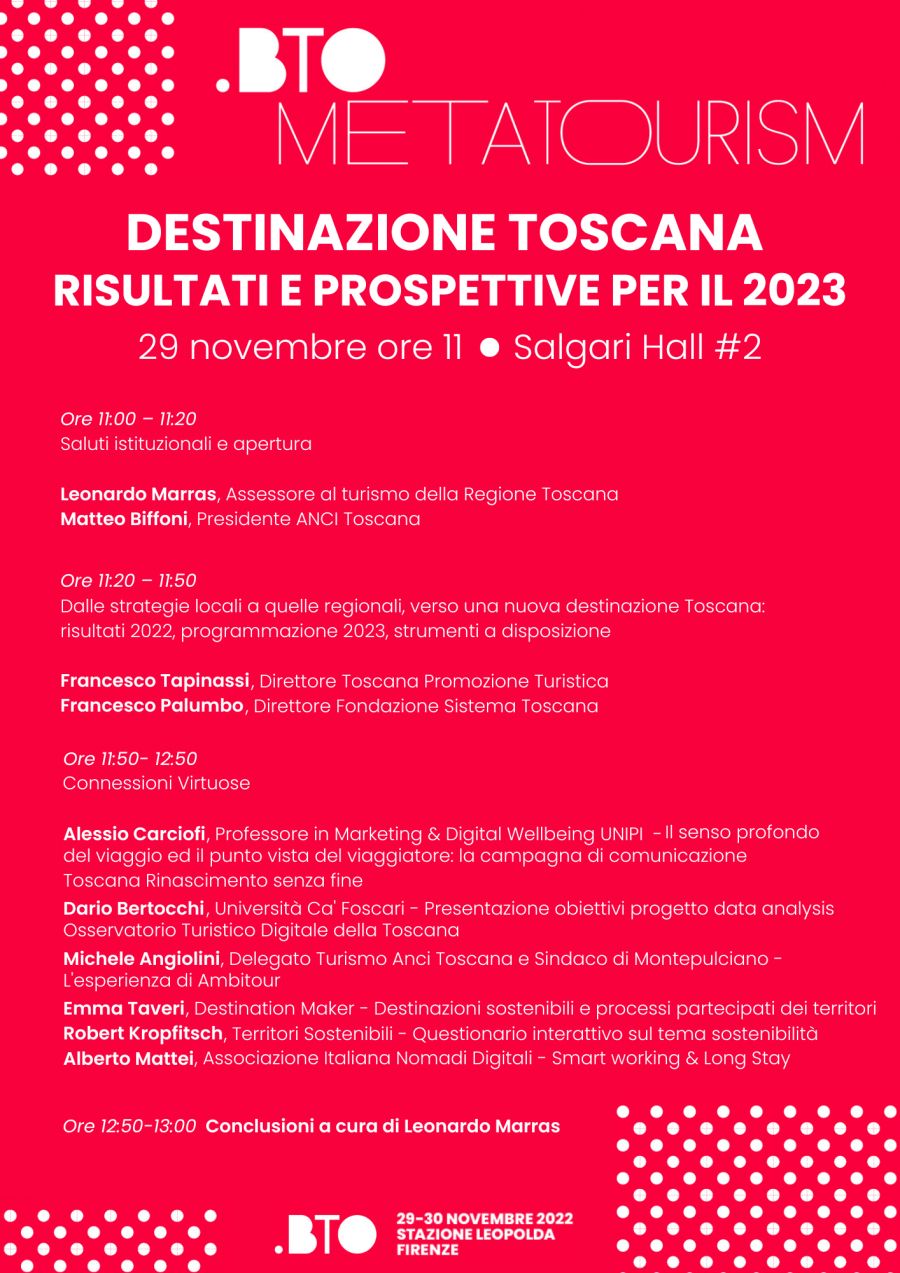 All'interno del fitto calendario della due giorni ci preme segnalarvi in particolare il panel sul turismo della nostra Regione"Destinazione Toscana, risultati e prospettive per il 2023"