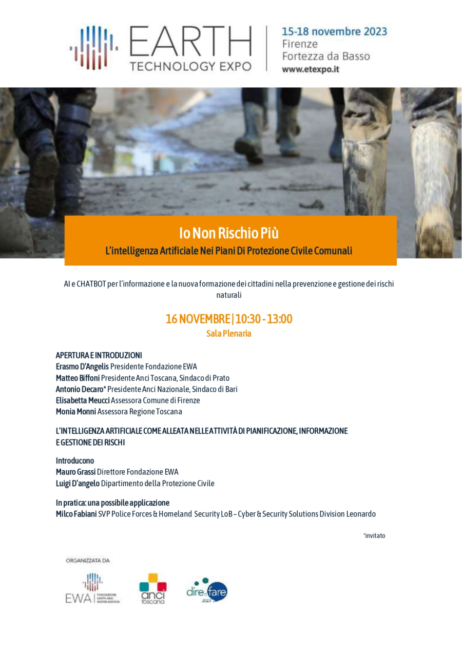L'incontro del mattino, dal titolo "Io non rischio più - L'intelligenza artificiale nei piani di Protezione Civile" porterà a confronto Istituzioni e Aziende leader nel settore tecnologico per capire come le nuove applicazioni di Intelligenza Artificiale possono aiutare le amministrazioni nella formazione e informazione dei cittadini e come possono guidarci nelle allerte.