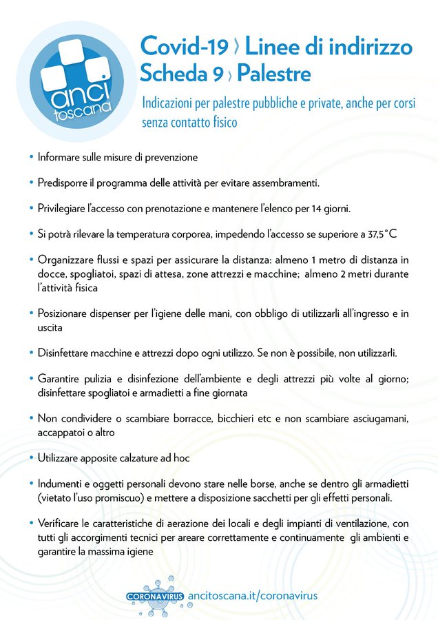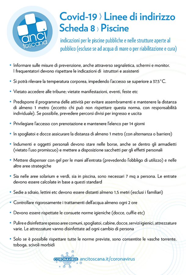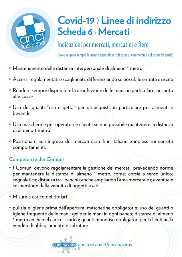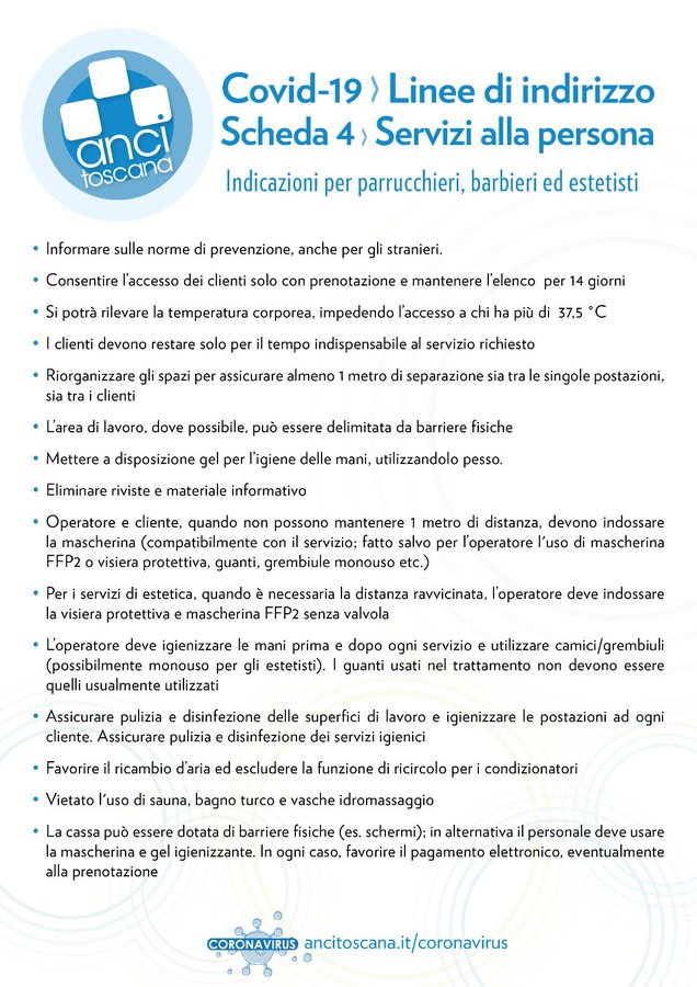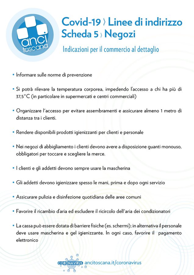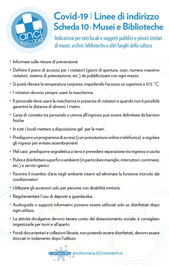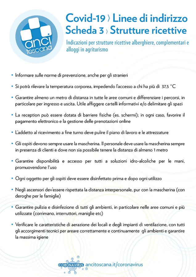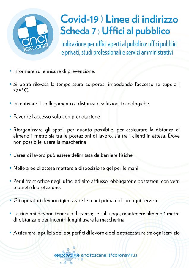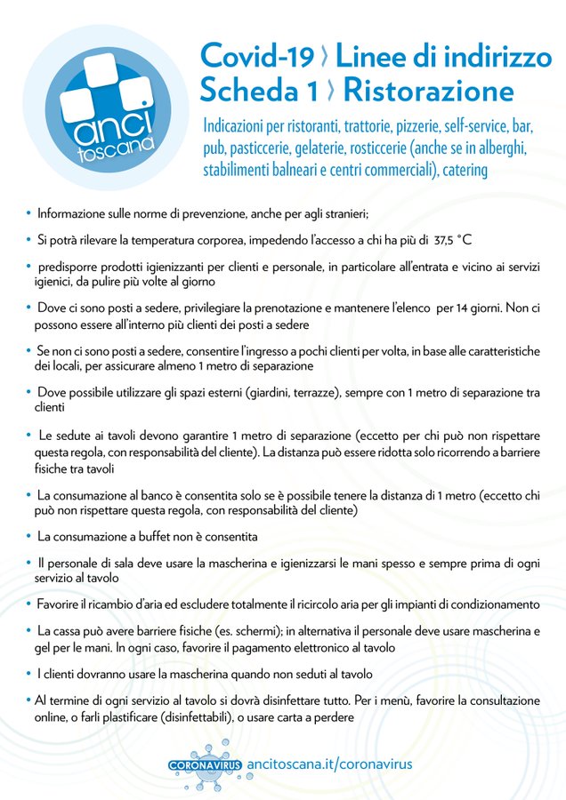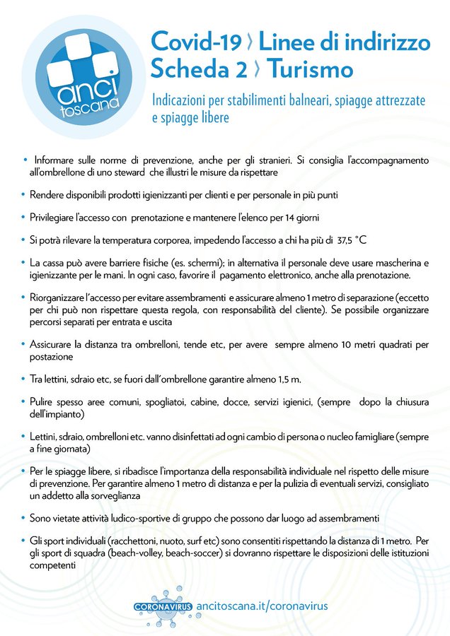 Anci Toscana ha elaborato in 10 schede  le linee guida delle Regioni che riguardano le principali attività che riaprono per la ripartenza: ristorazione, spiagge, alberghi, parrucchieri, negozi, mercati, uffici, piscine, palestre, musei. Ricordiamop che le linee guida sono state recepite del Dl Rilancio.