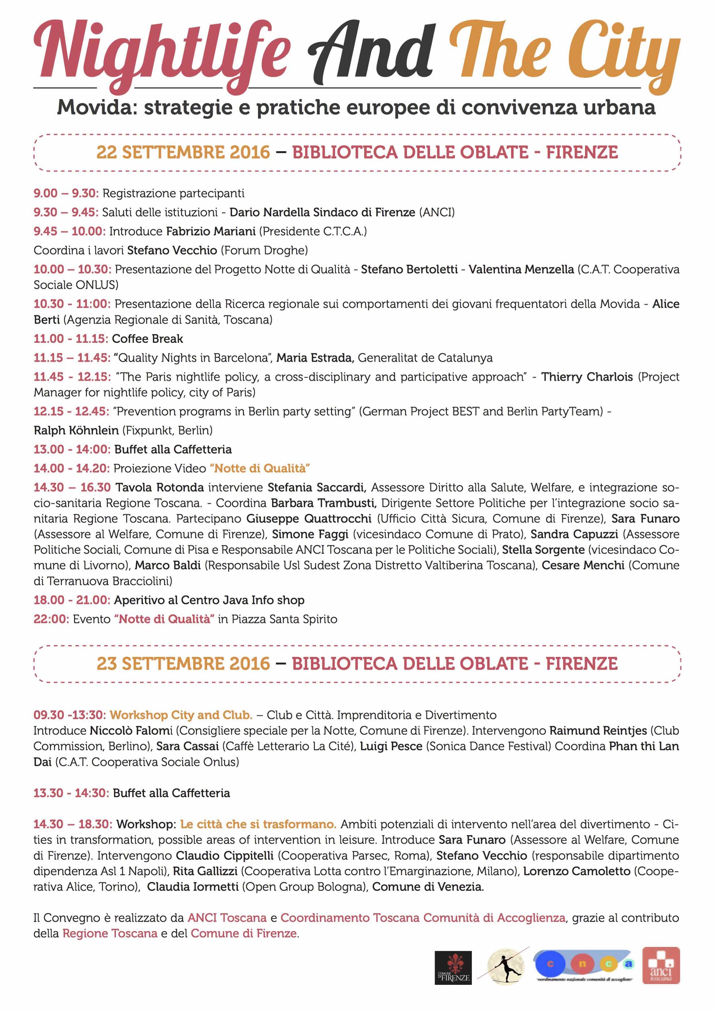 Durante la prima giornata (22 settembre), aperta dal Sindaco di Firenze Dario Nardella, verranno illustrate le esperienze delle città europee invitate, dei Comuni toscani che hanno partecipato al progetto Notte di Qualità, i risultati della Ricerca realizzata in collaborazione ad ARS Toscana sui comportamenti dei fruitori della movida in diverse città toscane e si concluderà con una tavola rotonda coordinata da Barbara Trambusti (Dirigente Settore Politiche per l’integrazione socio sanitaria Regione Toscana), con l' intervento di Stefania Saccardi (Assessore al Diritto alla Salute, Welfare e integrazione socio-sanitaria Regione Toscana).